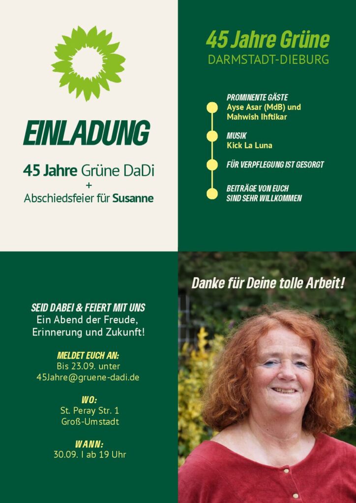 Am 30. September feiern wir nicht nur 45 Jahre GRÜNE im Landkreis DA-DI, sondern wir verabschieden auch unsere geschätzte Kreisgeschäftsführerin Susanne. Wir blicken gemeinsam auf Jahrzehnte grüner Politik zurück und nach vorne!